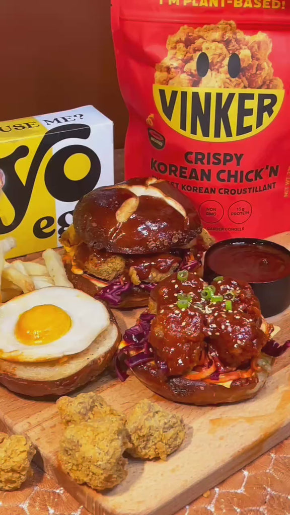 Looking for a vegan burger that’s bursting with flavor and texture? This Vinker Korean Crispy Chicken Burger is a game-changer! Packed with crispy, savory Korean-inspired Chick'n, a runny vegan sunny side up egg, vegan cheese, and a fresh slaw, this burger delivers a perfect balance of spice, crunch, and richness. Topped off with Vinker Gochujang sauce, it's sure to satisfy your cravings for something bold and indulgent, without compromising on flavor.