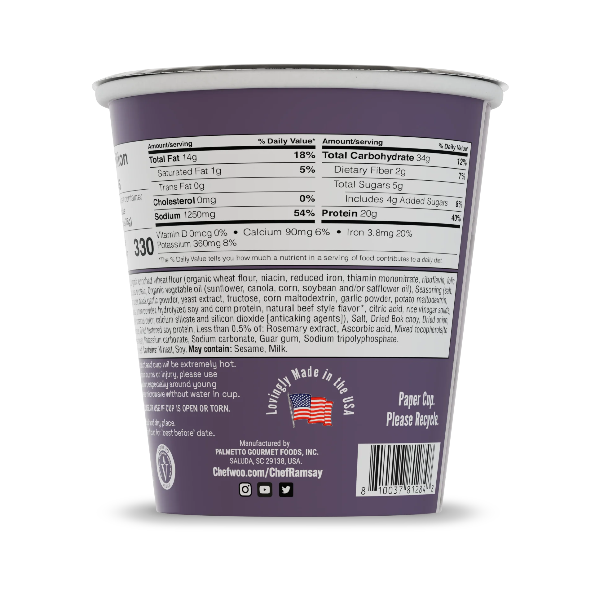 Organic noodle (organic unbleached wheat flour, organic pea protein, organic sunflower oil, salt, tocopherols, potassium carbonate, sodium carbonate, guar gum, sodium phosphate), Seasoning (sugars [sugar, brown sugar, fructose, corn maltodextrin, potato maltodextrin, fancy molasses], salt, black garlic powder, yeast extract, garlic powder, onion powder, hydrolyzed soy and corn protein, natural beef style flavour*, citric acid, rice vinegar solids, vinegar solids, caramel, calcium silicate, silicon dioxide), Dried bok choy, Dried onion, Dried bell pepper, Dried textured soy protein.