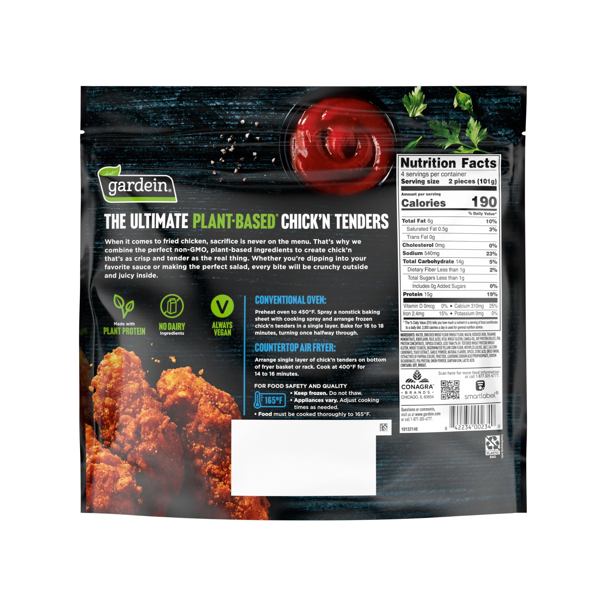Dig into Gardein's plant-based chick’n tenders, coated in an irresistible crispy, crunchy breading and designed to look, taste, and bake up just like real chicken tenders. 9 tenders per pack.