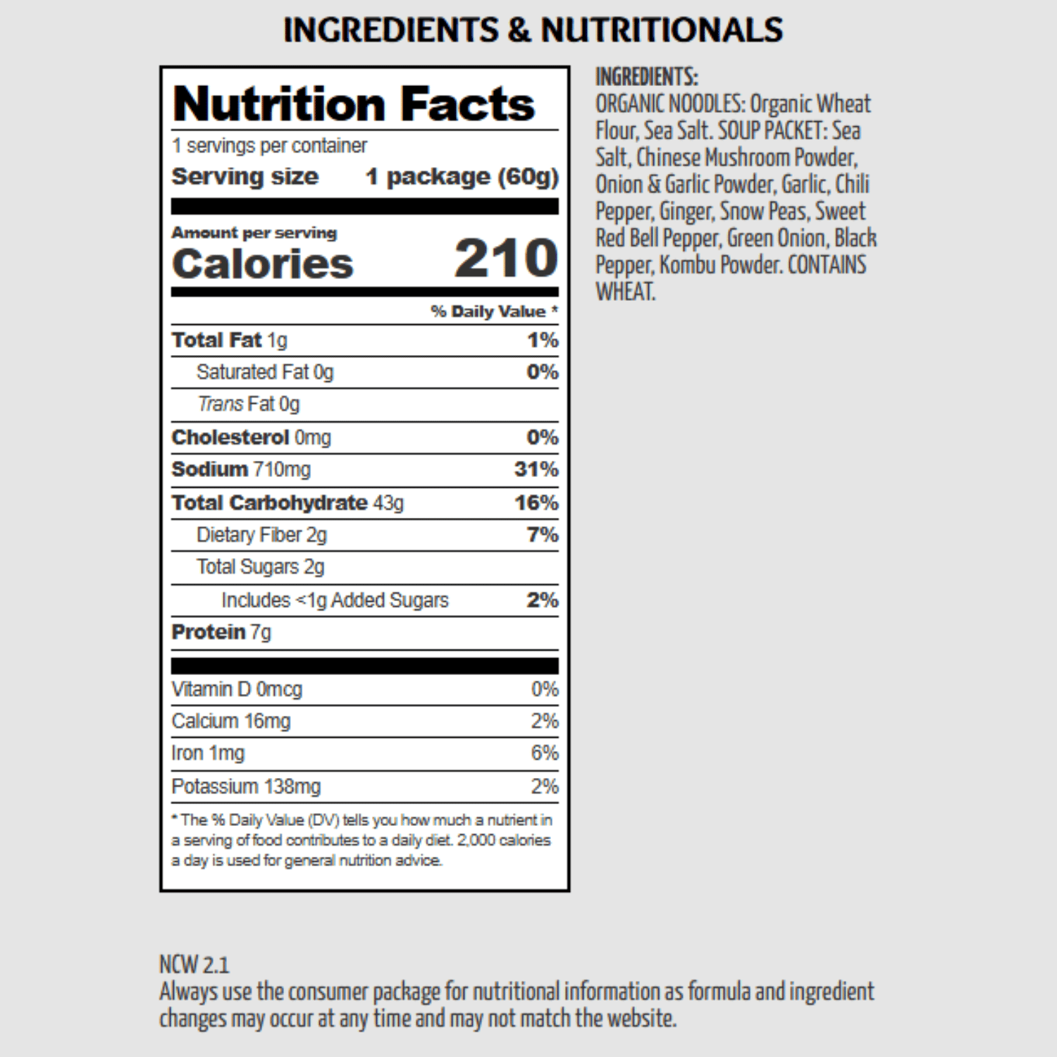 Ingrédients : Nouilles biologiques : Farine de blé biologique Heirloom et sel de mer. Sachet de soupe : sel de mer naturel, poudre de champignons, poudre de légumes (oignons, ail), sucre de canne naturel, ail, piment, gingembre, pois mange-tout, poivron rouge doux, oignon vert, poivre noir, poudre de kombu.