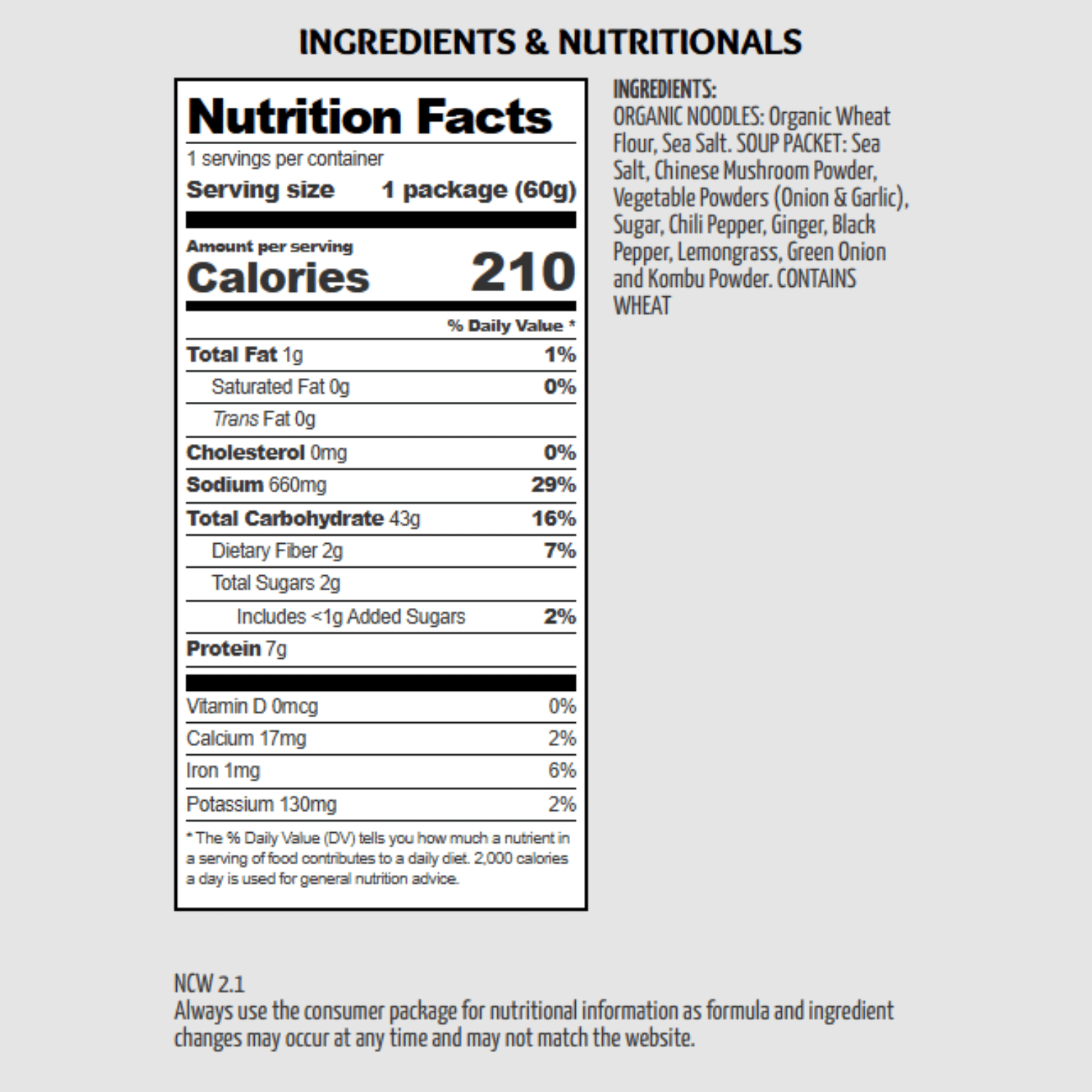 Ingrédients : Nouilles biologiques : Farine de blé ancestrale biologique et sel de mer. Sachet de soupe : Sel de mer naturel, poudre de champignons chinois, poudres végétales (oignon, ail), sucre de canne naturel, piment, gingembre, poivre noir, citronnelle, oignon vert, poudre de kombu.