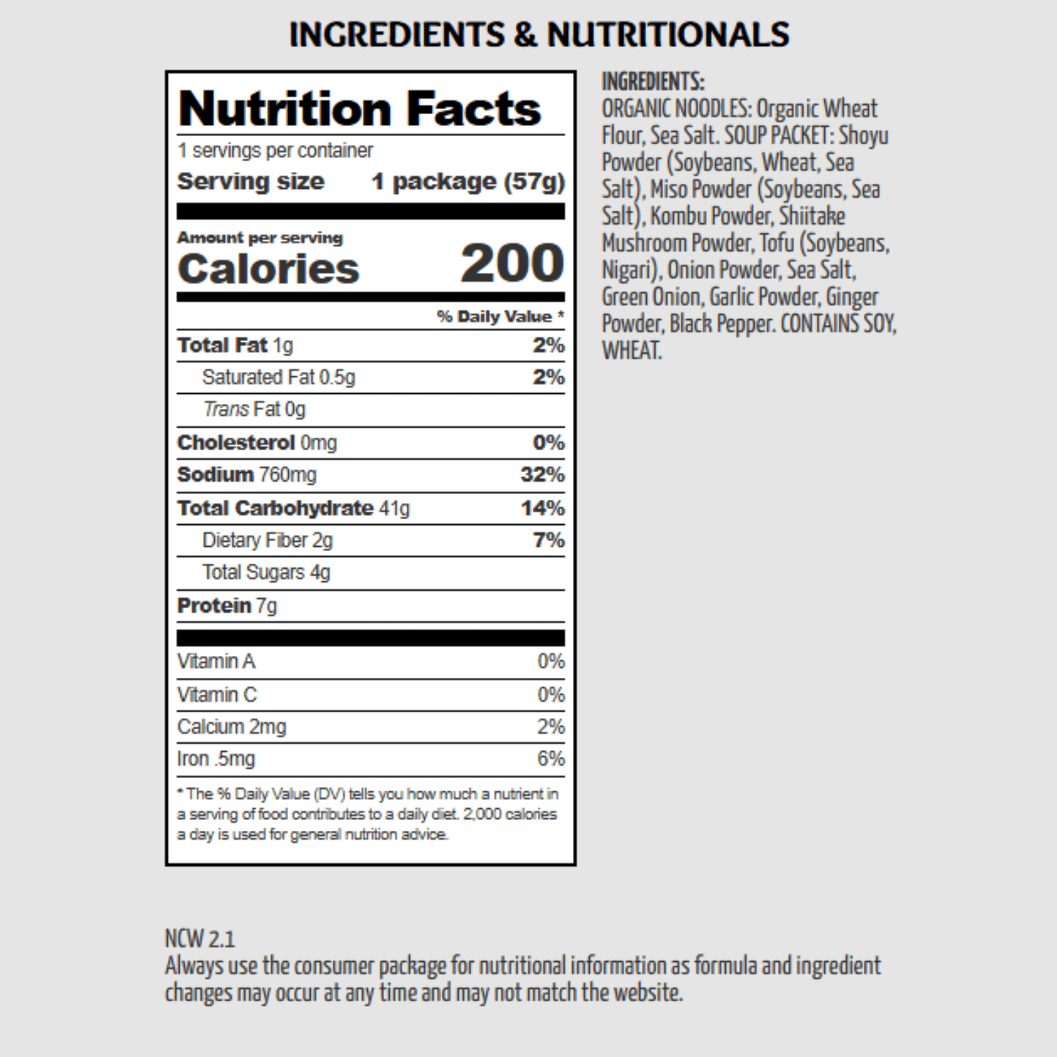 Ingrédients : Nouilles biologiques : Farine de blé biologique Heirloom et sel de mer. Sachet de soupe : poudre de shoyu (soja, blé, sel de mer), poudre de miso (soja, riz, sel de mer), poudre de kombu, poudre de champignons shiitake, tofu (graines de soja, nigari, poudre d'oignon, sel de mer, oignon vert, poudre d'ail, gingembre Poudre, Poivre Noir.