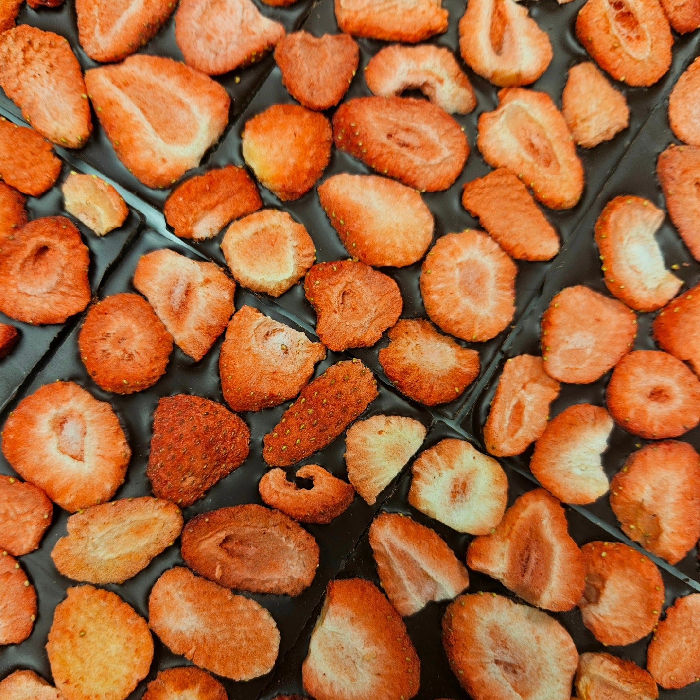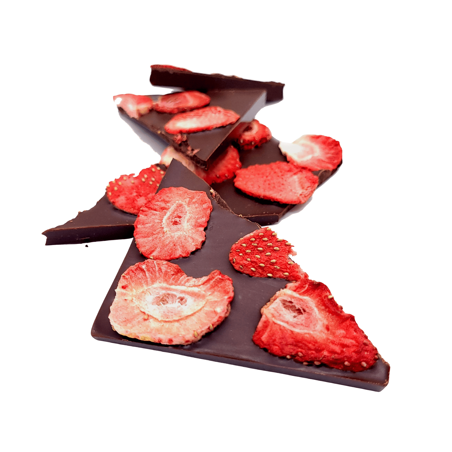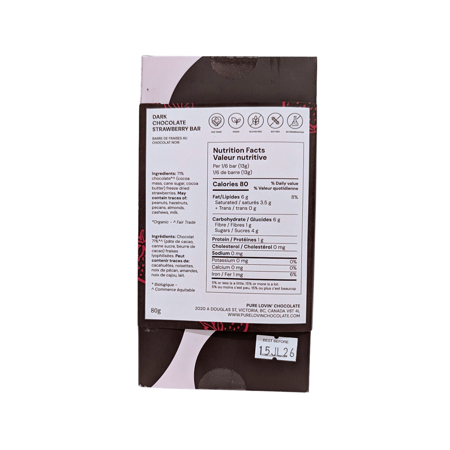 Dark Chocolate Strawberry Bar Ingredients: Organic, Fair Trade 71% dark chocolate (cocoa mass, cane sugar, cocoa butter), freeze dried strawberries.