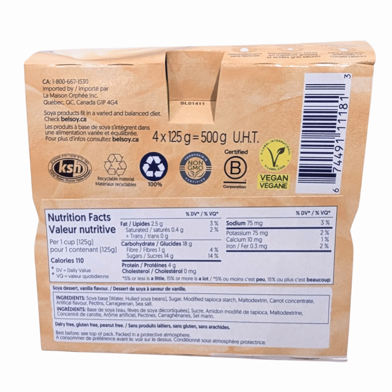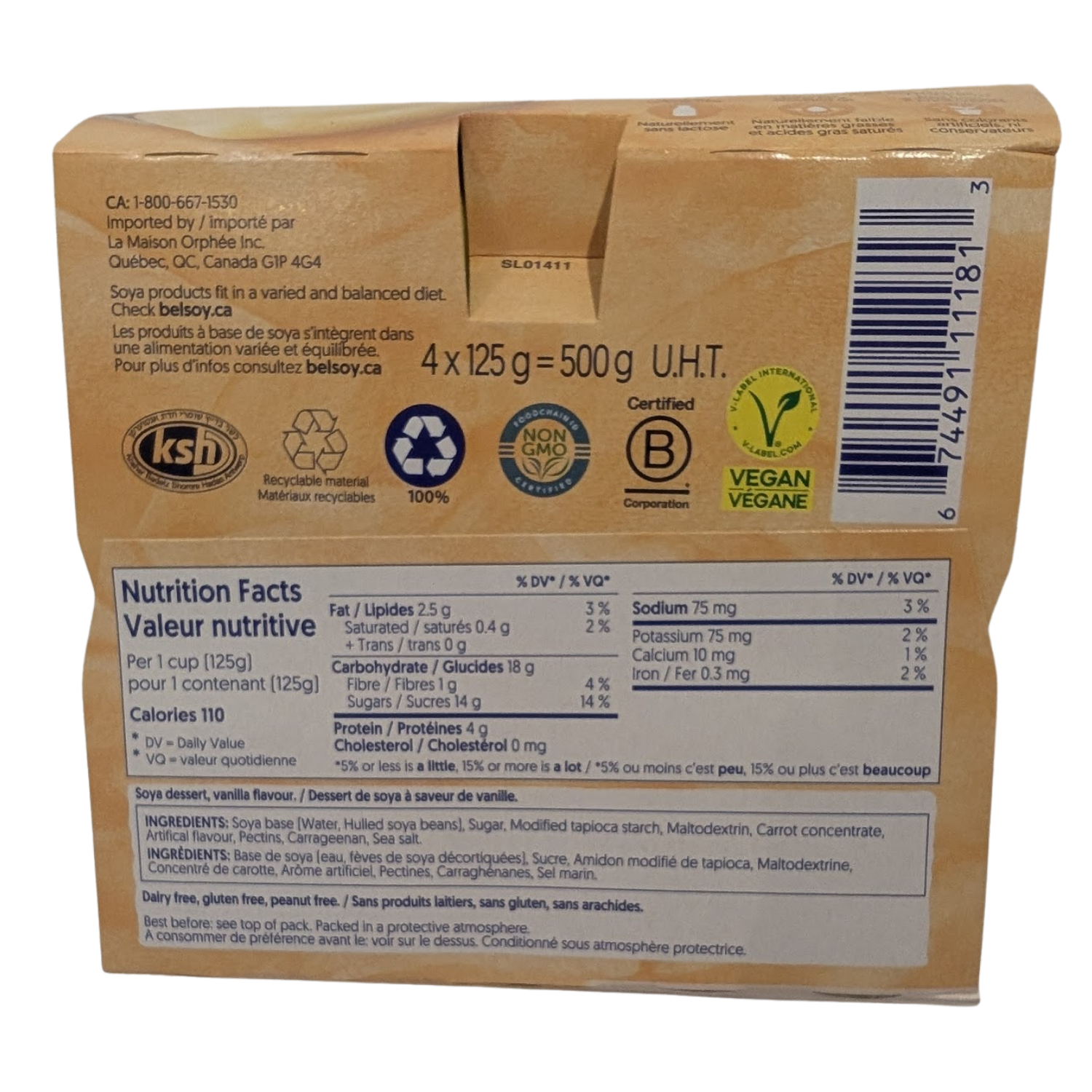 Soja et vanille en parfaite harmonie. La vanille dessert Belsoy prouve que les bienfaits végétaux du soja vont de pair avec le goût intemporel et subtil de la vanille. La texture veloutée et crémeuse et le goût riche et rond de la vanille rendent chaque cuillerée délicieuse.Ingrédients : Boisson de soja enrichie (eau, graines de soja décortiquées (6,4%), phosphate tricalcique, vitamines (riboflavine, B12, D2)), sucre, épaississants (amidon de tapioca modifié, pectine, carraghénine), maltodextrine, arôme, sel marin , colorant (curcumine, rocou). Contient du soja.