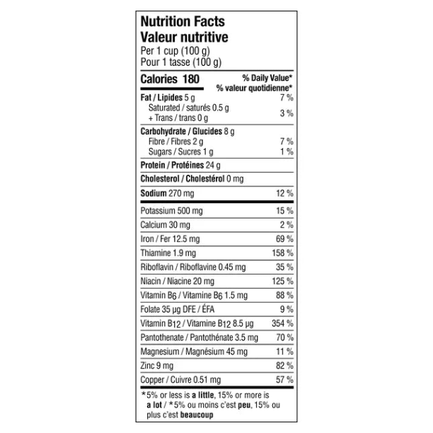 Ingrédients : eau, gluten de blé, protéine de féverole, huile de canola pressée par pression, sel, arôme naturel et moins de 1 % d'épices, poudre d'ail, poudre d'oignon, concentré de grenade, extrait de levure, lécithine de tournesol, jus de fruits et de légumes .