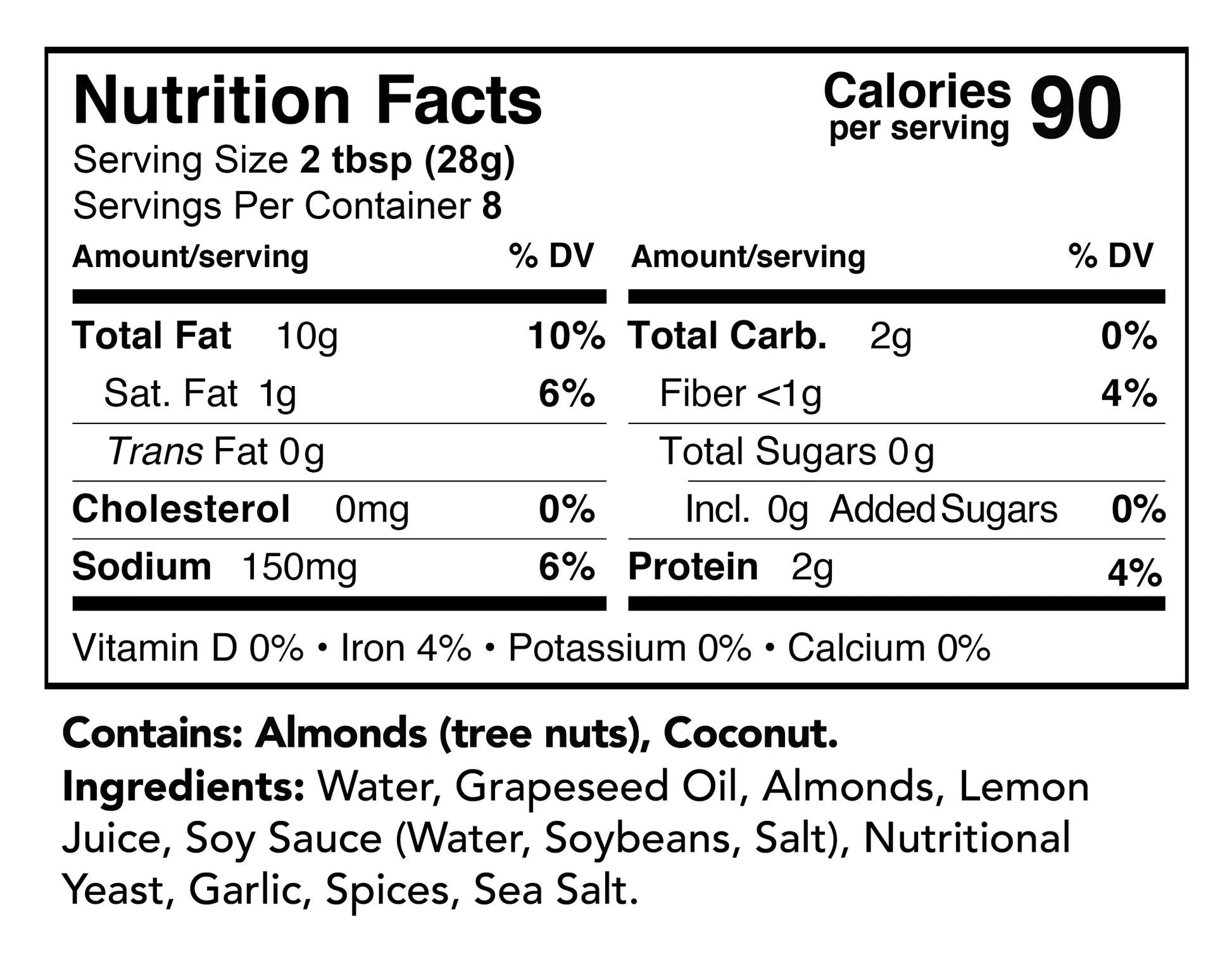 eau, huile de pépins de raisin, amandes, jus de citron, sauce soja (eau, graines de soja, sel), levure nutritionnelle, ail, épices, sel de mer