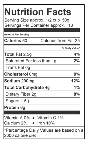 Ingrédients : graines de soja entières non OGM (soja), cultivées sans pesticides chimiques, protéines de soja hydrolysées non OGM (soja), jus de canne évaporé biologique, maltodextrine, sel de mer, flocons de piment chipotle, poudre d'ail, poudre de vinaigre, épices.