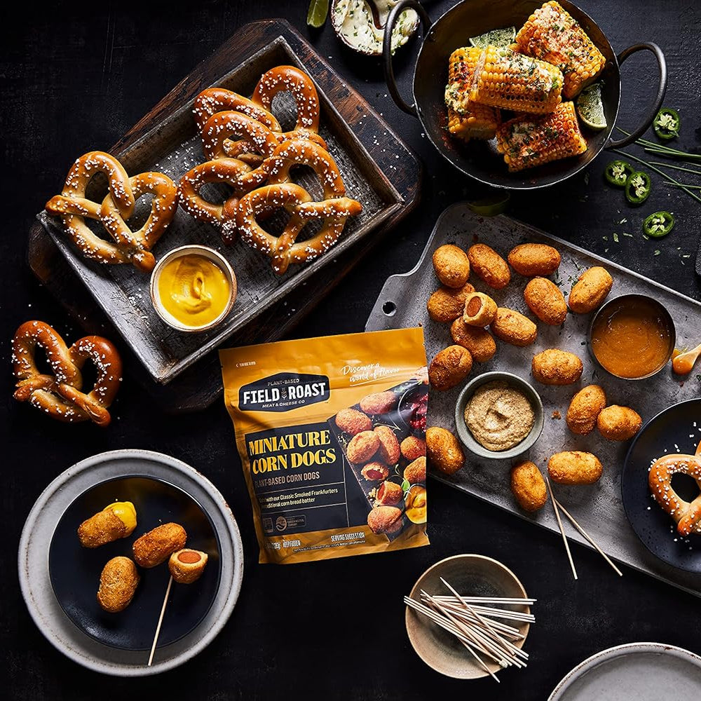 Les chiens de maïs miniatures primés de Field Roast rappellent les foires de comté, les parcs d'attractions et les divertissements estivaux. Ils commencent par des saucisses de Francfort rôties sur le terrain, les trempent dans une pâte à pain de maïs sucrée traditionnelle et les croustillent à la perfection. Amusez-vous mais rythmez-vous! Plus la moutarde est jaune, mieux c'est !Ingrédients : Frankfurter (eau filtrée, gluten de blé vital, huile de carthame pressée par pression, extrait de levure [levure, sel, sucre, arôme naturel], huile de fruit de palme pressée par pression biologique, extrait de malt d'orge, pâte de tomate, vinaigre de cidre de pomme, colorant paprika, épices, sel de mer, oignons, farine de blé, ail, arôme naturel de fumée, graines de céleri, colorant oléorésine de paprika), enrobage de pâte (farine de blé, semoule de maïs jaune dégéminée, amidon de maïs, fructose, sucre de canne, levure [pyrophosphate acide de sodium, bicarbonate de soude ], sel marin, gomme xanthane). Partiellement frit dans de l'huile de canola pressée par pression.
