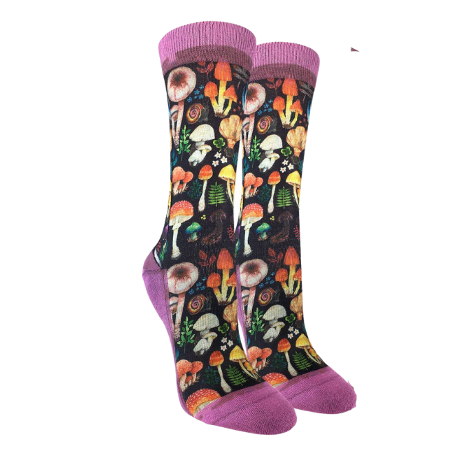 We've got some fun fungi for your feet! These cool mushroom socks feature a colorful pattern of different variety of mushrooms.