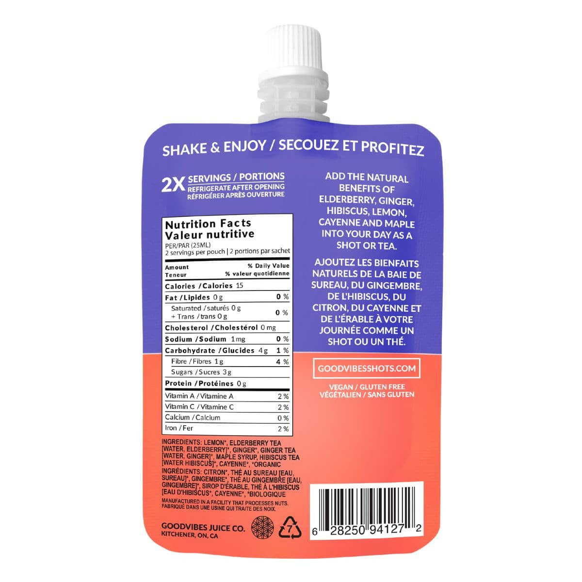 Ingrédients : Citron*, Thé de sureau (eau, sureau*), Gingembre*, Thé au gingembre (eau, gingembre*), Sirop d'érable, Thé d'hibiscus (eau, hibiscus*), Cayenne* *biologique