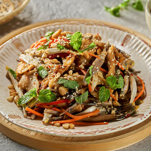 Ingrédients : Protéine de soja texturée sans OGM (protéine de soja, protéine de blé, huile de soja, amidon de tapioca), eau, huile de soja, protéine de soja isolée, amidon de tapioca modifié, sucre de canne brut, sel, tréhalose, levure, poivre blanc, glucose cristallisé , arôme basilic, poudre de moutarde.