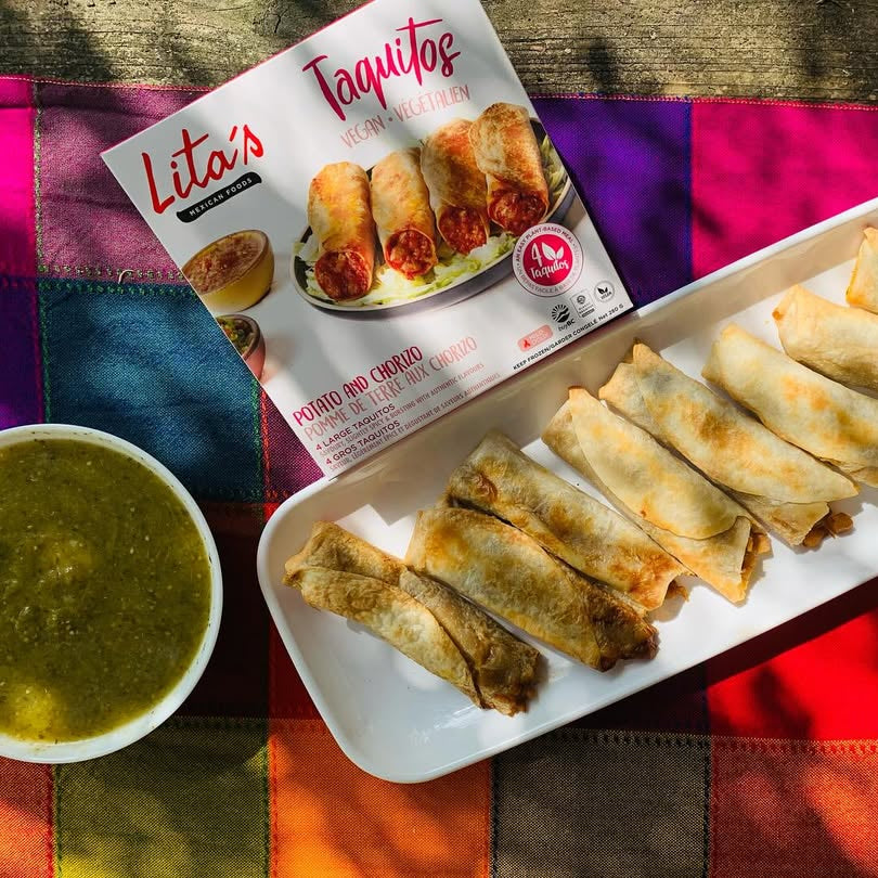 Les taquitos végétaliens aux pommes de terre et au chorizo de Lita font une collation ou un apéritif incroyable! Ils peuvent être cuits, frits ou frits à l'air rapidement à partir de surgelés.