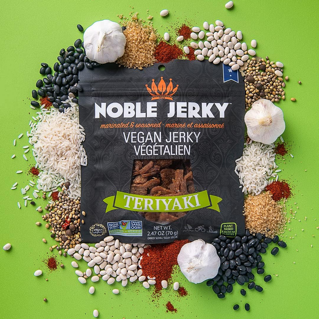 Teriyaki végétalien mariné à l'ail et au gingembre. Protéine à base de plantes avec un vrai goût et texture de viande séchée.