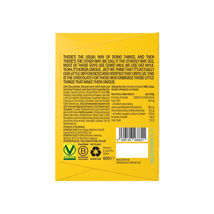 Salty. Sweet. Seriously addictive. This chunky bar is all about balance – rich caramel flavour meets a whisper of sea salt, wrapped up in our signature oat m*lk chocolate made with single-origin Colombian cocoa.
