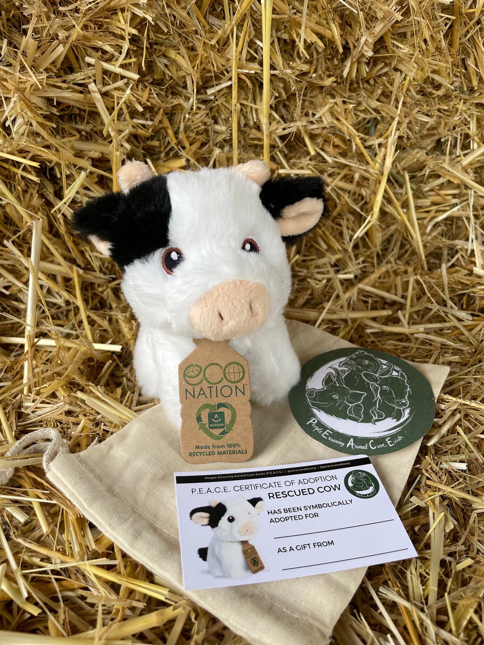 Each sponsor kit comes with a 5" eco stuffed farm animal of your choosing (cow, sheep, or pig), a personalized adoption card, and a P.E.A.C.E Farm Sanctuary sticker. All in a cute bag to keep it all together.