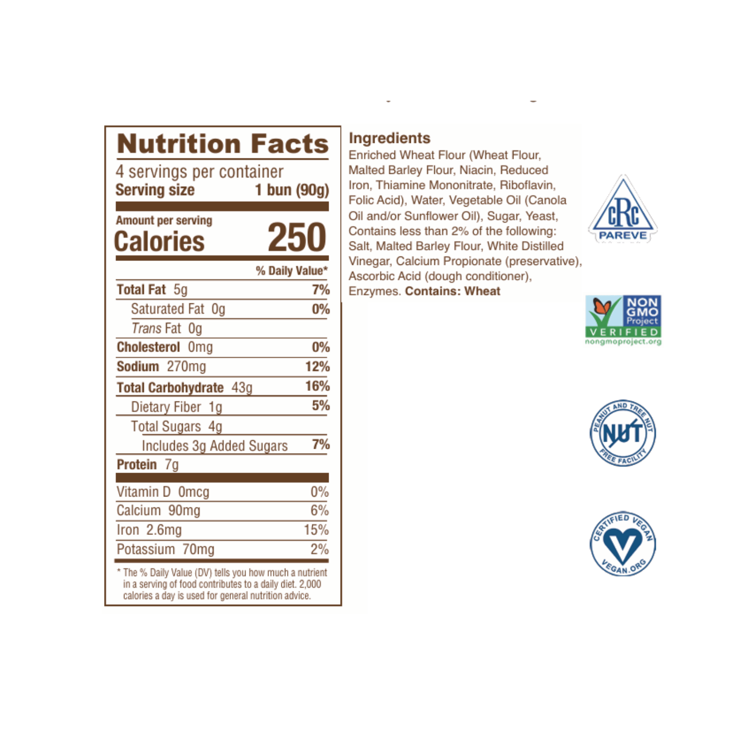 Ingrédients : farine enrichie (farine de blé, farine d'orge malté, niacine, fer réduit, mononitrate de thiamine, riboflavine, acide folique), eau, huile de canola, sucre, contient moins de 2 % de chacun des éléments suivants : levure, orge malté, sel , farine de blé, dextrose, hydroxyde de sodium, maltodextrine, dextrose de culture, amidon de blé, farine d'orge malté, acide ascorbique ajouté comme conditionneur de pâte, huile de soja, enzymes, sulfate de calcium, cellulose microcristalline.