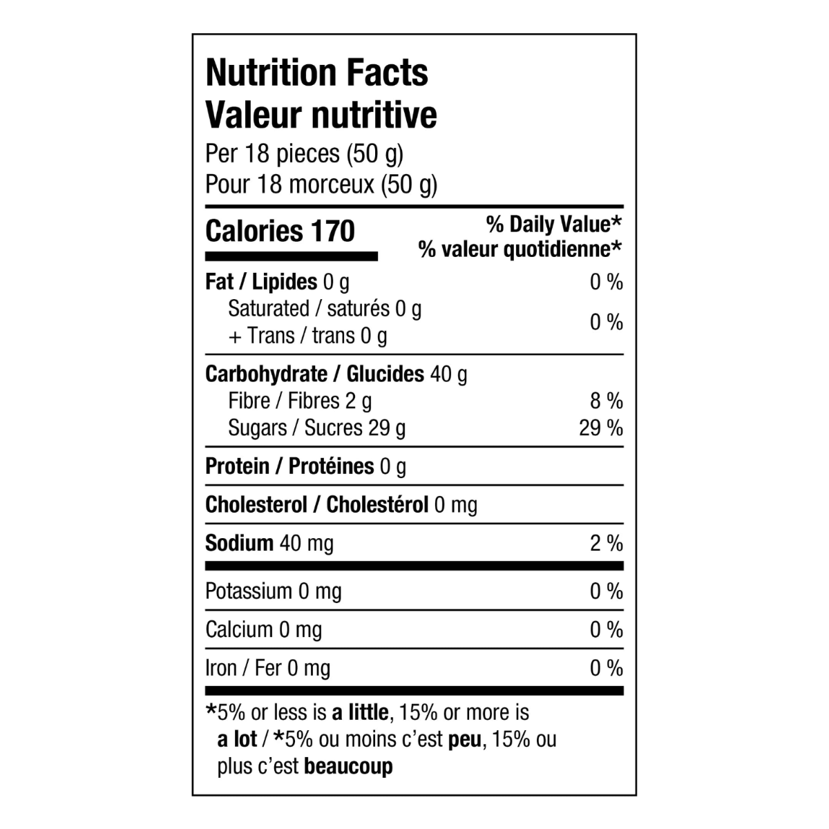 Ingrédients : Sucres (sirop de glucose, sucre), eau, pectine, acide citrique, concentrés de jus de fruits (pomme, poire, raisin, pêche), arômes artificiels, colorants naturels (cassis, carotte noire).