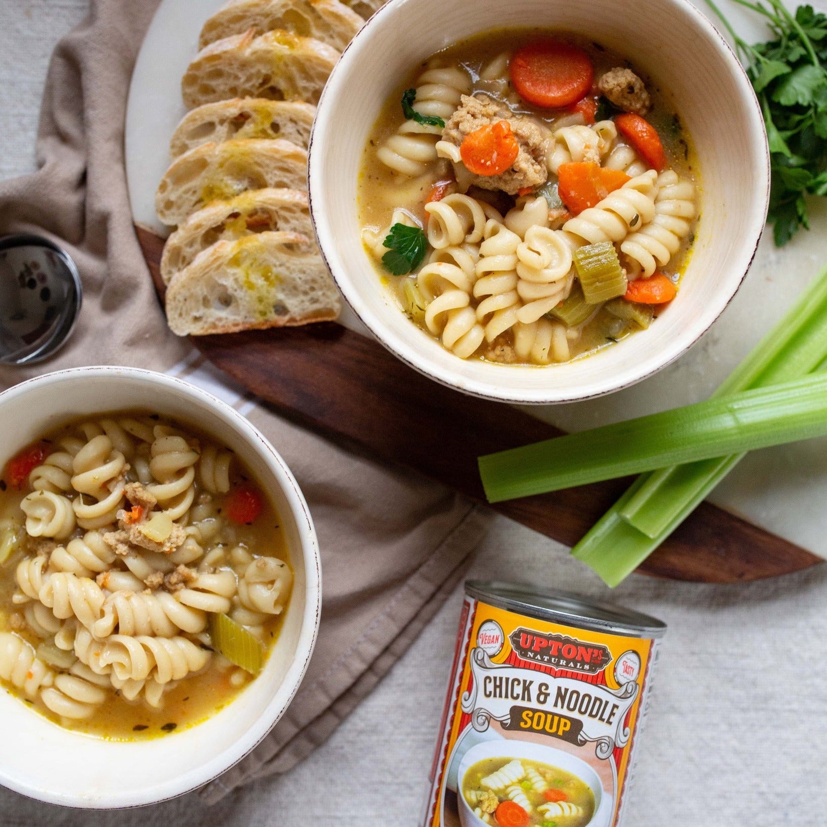 Crafted with nourishing ingredients to hit just the right spot, Upton's take on the classic chicken noodle soup has pasta noodles, herbs & spices, and their delicious Chick seitan with 10g of protein per can. No added colours, flavours or preservatives. Perfect to warm you up on a cold day!