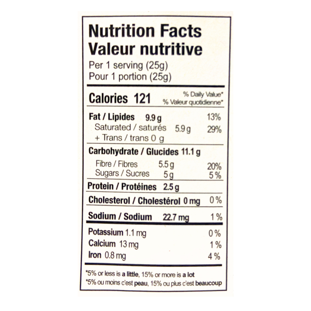 Ingrédients : éclats de cacao*, sucre de coco**, beurre de cacao*, sel fumé à l'érable, romarin*.