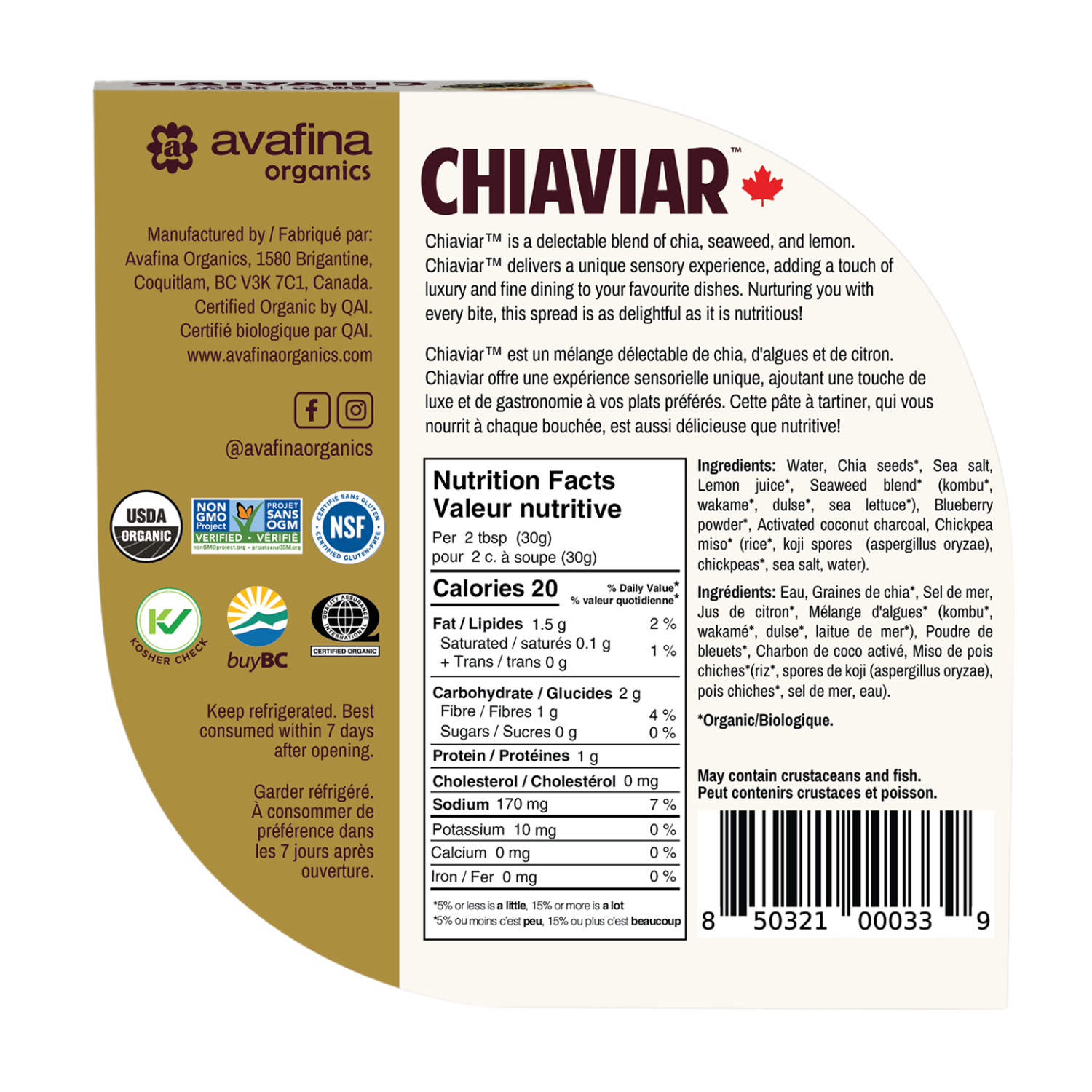 Chiaviar is a delectable blend of chia, seaweed and lemon. Chiaviar delivers a unique sensory experience by combining the buttery texture of seaweed with the nutty taste of chia, adding a touch of luxury and fine dining to your favorite dishes. The combination of Superfoods in Chiaviar provides a source of protein, omega-3, fiber, vitamins, minerals and micronutrients. Nurturing you with every mouthful, this spread is as delightful as it is nutritious.