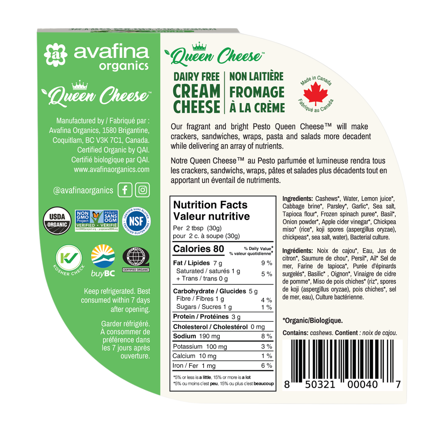Avafina's Pesto Queen Cheese is a delicious, fragrant and bright, non-dairy cream cheese alternative. This aromatic and flavorful Pesto Queen Cheese™ will make any crackers, sandwiches, wraps, canapés, salads, and pasta more decadent. Use it as you would cream cheese. Delight your senses and celebrate healthy food with your friends and family!