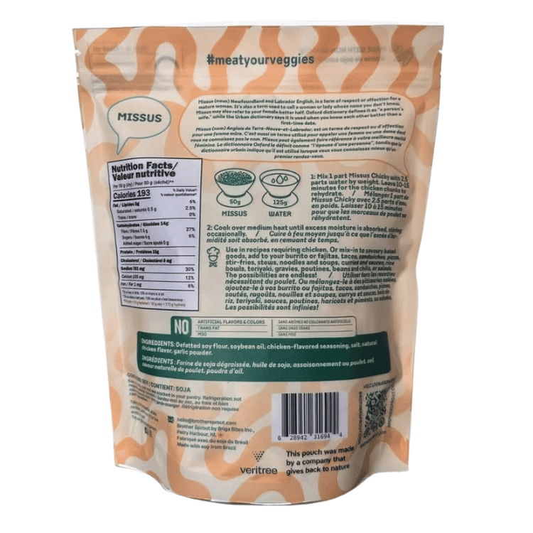 Savoury chicken flavour that mimics the taste and texture of chicken bits. Made from soy flour with a complete amino acid profile. Rich in fiber, protein, iron, calcium, and potassium.