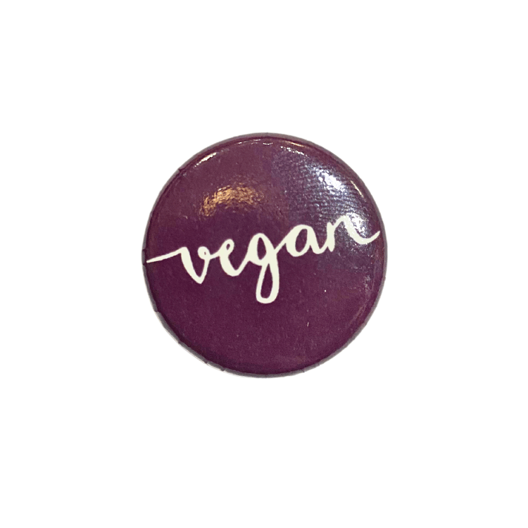 An elegantly scripted vegan statement button.
