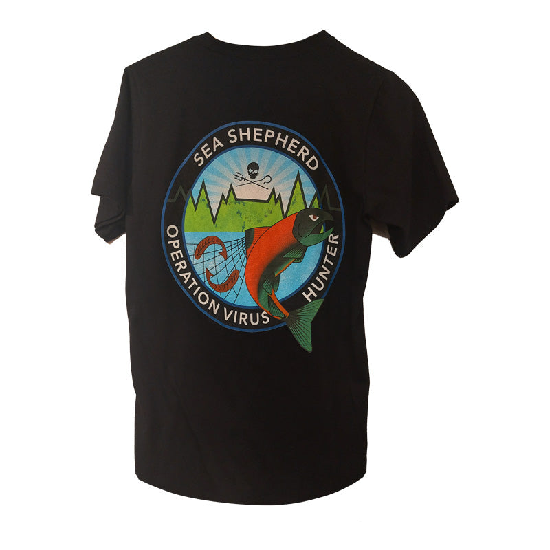 A simple black tee with the Sea Shepherd Jolly Roger logo printed on the front and their Operation Virus Hunter logo on the back.