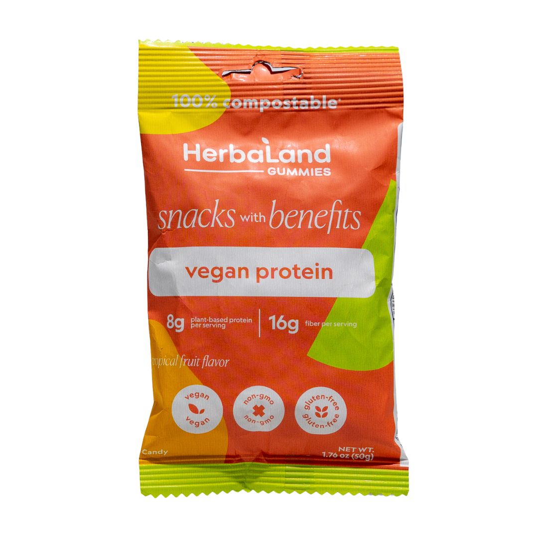 Herbaland's mango papaya-flavoured vegan protein gummies are an easy and delicious on-the-go snack. Each pouch is packed with nutrient-dense superfoods, protein, and fiber to provide an all-around snack for any occasion.