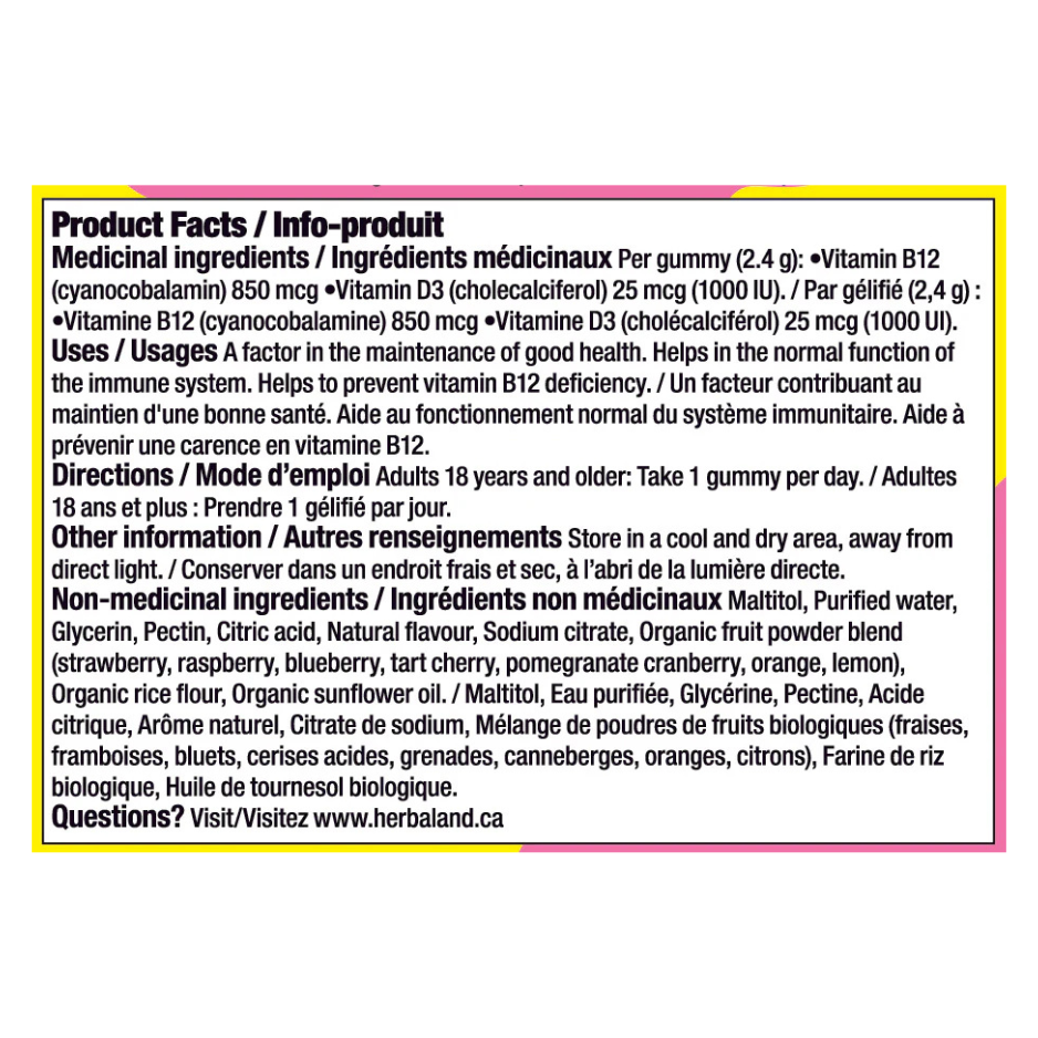 Get a delicious daily boost with Herbaland Vegan D3 and B12 gummies. These raspberry flavoured, plant-based vitamin supplements are formulated with lichen-sourced vitamin D3 and vitamin B12 to support red blood cell formation, enhance immunity, and boost your energy levels.