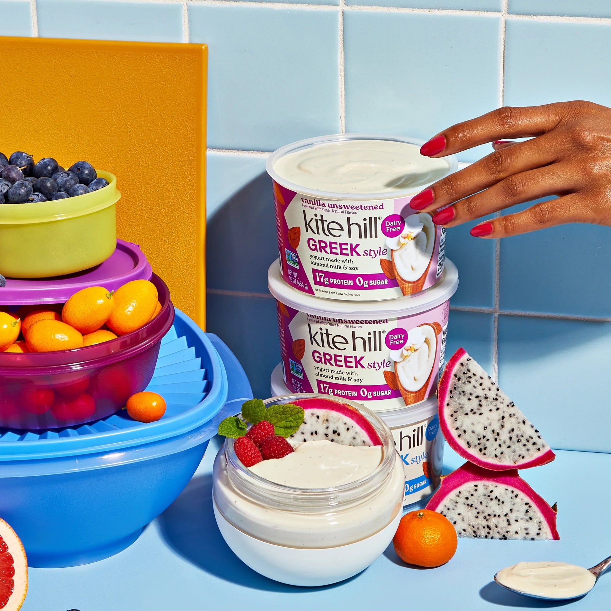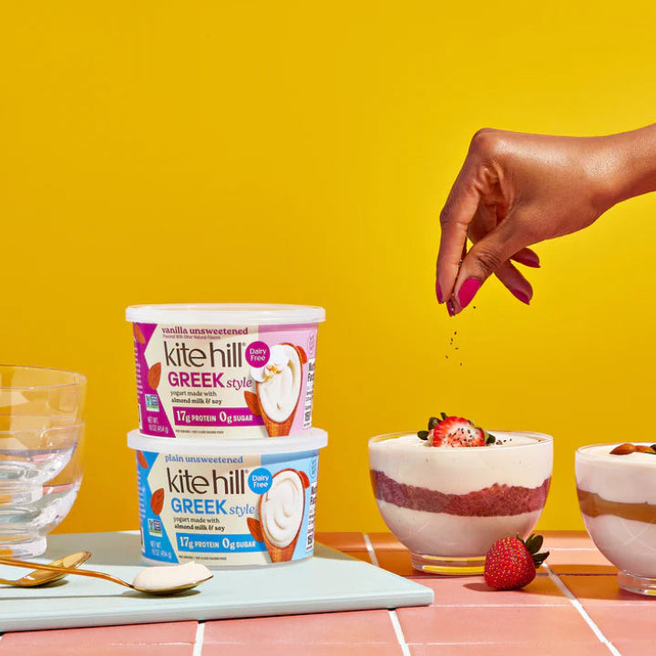 Kite Hill's smooth unsweetened vanilla bean Greek yogurt gives you the goodness of up to 17g of protein and 0g of sugar with live active cultures in every cup.