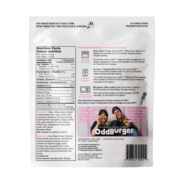 Crispy, seasoned outside, scrumptious vegan chickun fillet inside. Made by London ON's own vegan fast food joint, these chicken fillets are great as the star of the dinnertime show, or tucked in a bun with your favourite toppings.