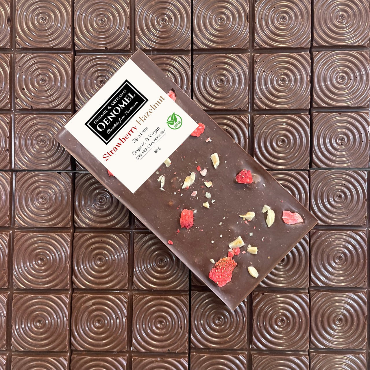 55% Organic Milk Chocolate with Strawberries and Hazelnuts.