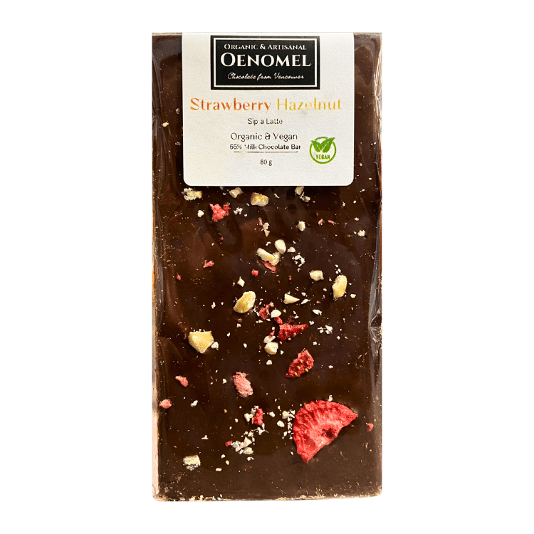 The chocolate is mixed with pieces of dried strawberries and roasted hazelnuts, adding a sweet and nutty flavour to the milk chocolate. The combination of milk chocolate, strawberries, and hazelnuts creates a delectable taste, with the creamy milk chocolate balancing the strawberries' tartness and the hazelnuts' crunchiness. Additionally, using organic ingredients ensures that the chocolate is made with ingredients free of pesticides and harmful chemicals, making it a healthier and more sustainable option.