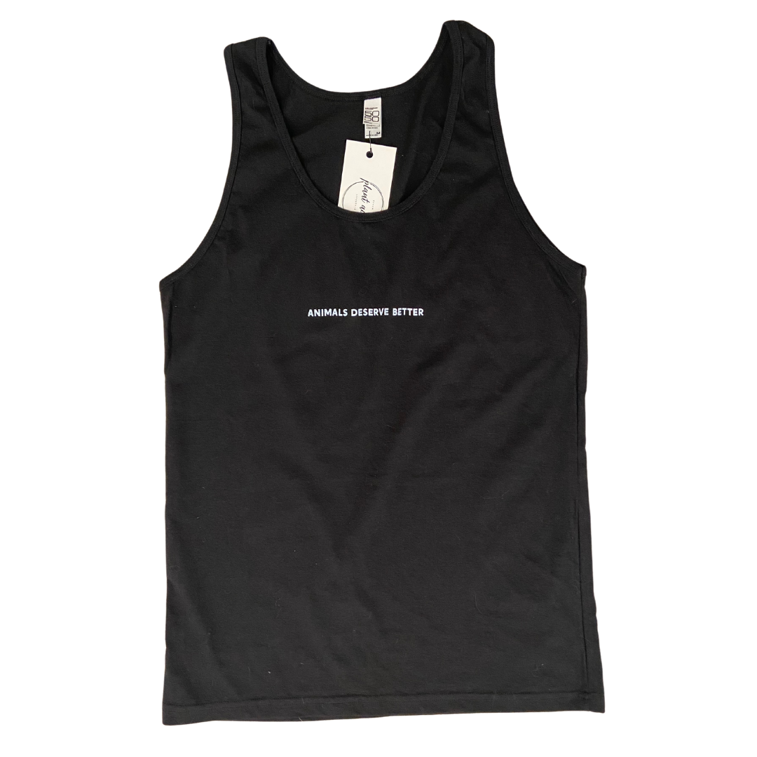 A plain black tank with 'Animals Deserve Better' printed in white on the chest. Sometimes a simple message says it all.