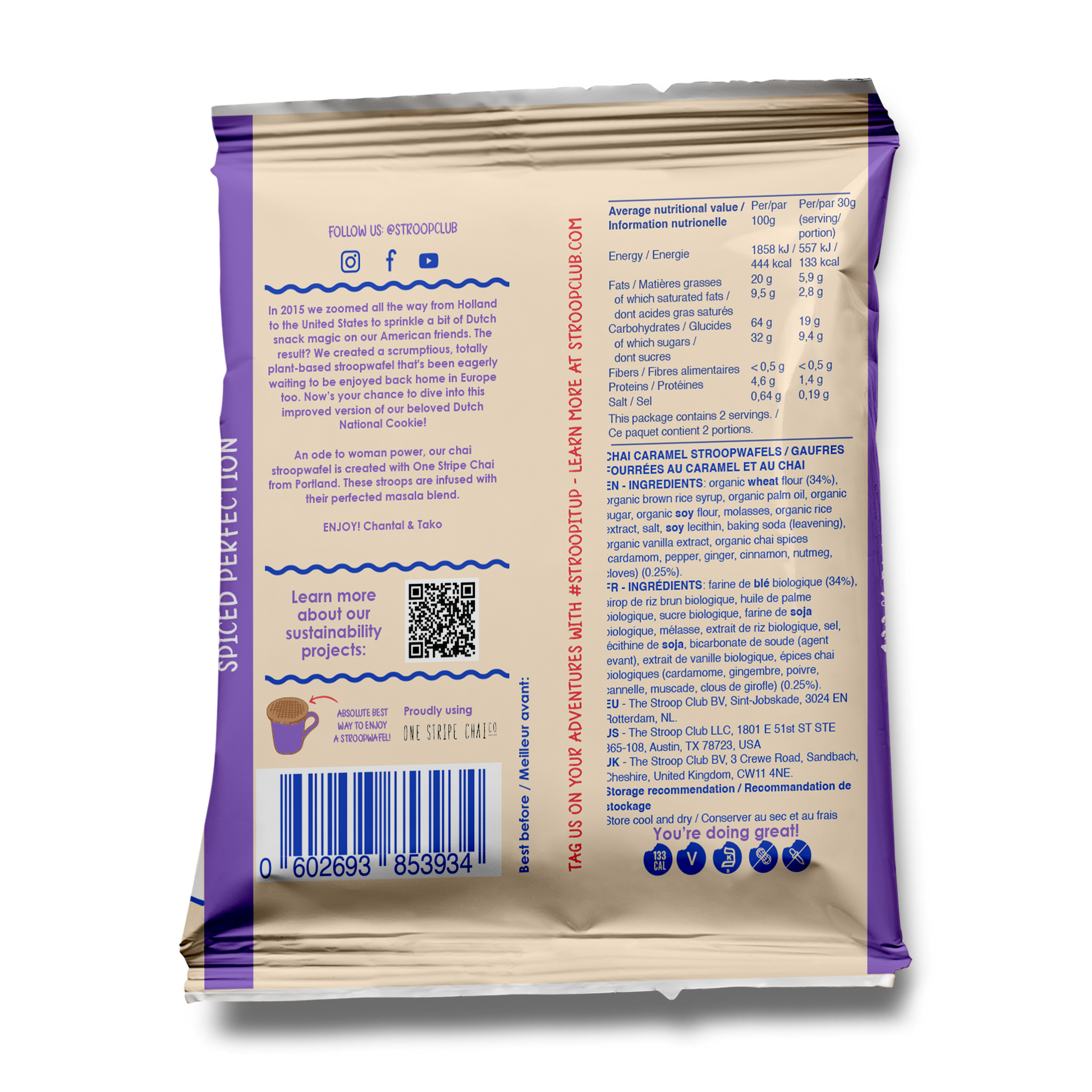 In this fruitful collaboration with One Stripe Chai from Portland, Oregon, Stroop Club created all the warmth of chai tea in its most solid form. Not too sweet and the perfect masala spices blend make this stroopwafel flavour our new favourite! Enjoy one with a hot chocolate or a hot tea and get all cozy and warmed up with a spicy after kick.